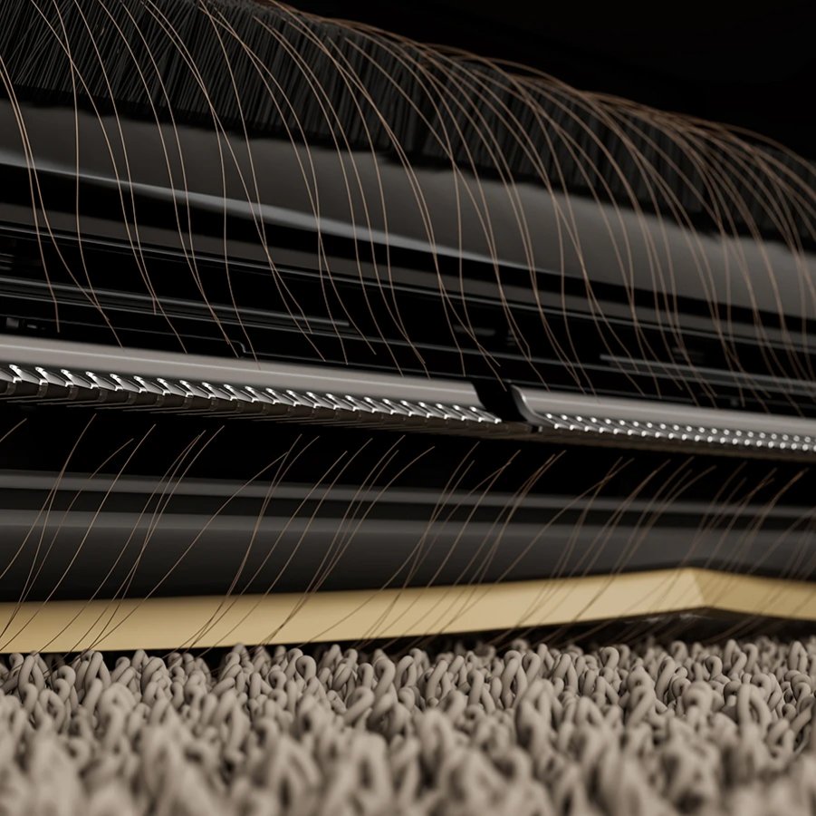 Щетка TriCut автоматически срезает и переносит застрявшие волосы в мешок для мусора, облегчая обслуживание щетки и повышая его эффективность.
