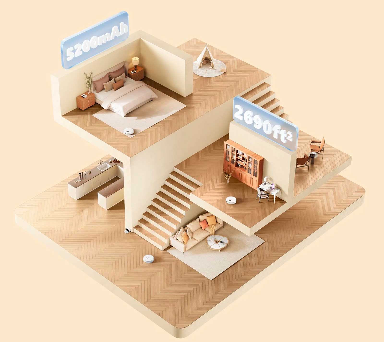 Робот-пылесос может убирать большие площади благодаря аккумулятору на 5200 мАч, вместительному контейнеру для пыли на 570 мл и резервуару для воды на 270 мл.