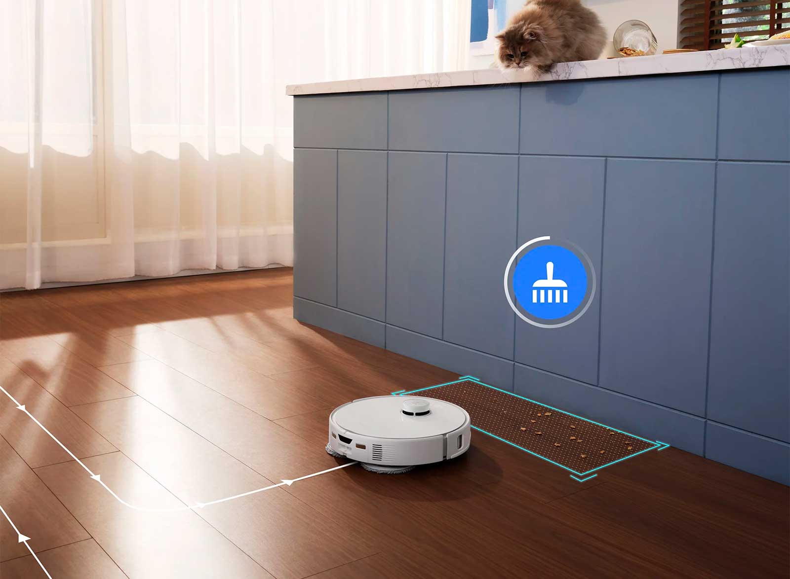 Быстро устраняет неожиданные разливы и беспорядок, а при необходимости избегает определенных участков, обеспечивая точную очистку с учетом насущных потребностей.