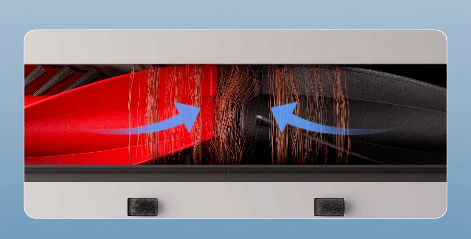 Щетка DuoDivide™ оснащена двумя параллельными роликами с короткой щетиной и спиральными лезвиями, которые направляют волоски к центральному впускному отверстию мусорного бака, где мощное