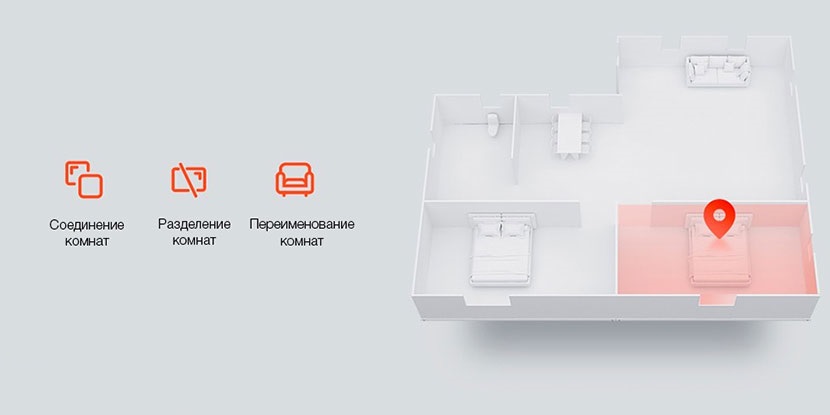 После первой уборки пылесос автоматически составляет карту помещения и разделяет его на комнаты или области. Вы можете самостоятельно объединить, разделить или переименовать их для удобной работы и передачи указаний пылесосу.