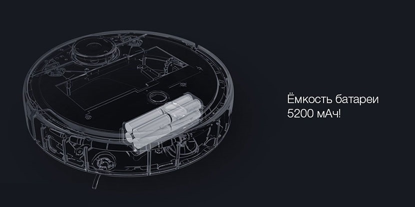 В стандартном режиме аккумулятор ёмкостью 5200 мА·ч обеспечивает пылесосу 2.5 часа работы, чего хватит для полной уборки 250 м². Кроме того, функция автоматического возврата не оставит без заряда посреди уборки.