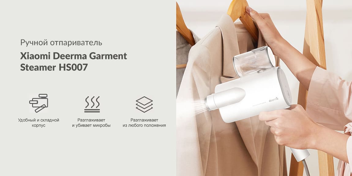 Ручной отпариватель Xiaomi Deerma Handheld Garment Steamer Mini TravelГромоздкие неудобные и тяжелые утюги уходят в прошлое в современным отпаривателем одежды Xiaomi Deerma DEM-HS007! Складная конструкция, небольшой размер (15 см) и легкость в применении позволят вам всегда иметь красивый и опрятный вид. И поверьте, если “встречают по одёжке”, то вам будут всегда рады! Всего за три минуты вы сможете привести вещи в порядок, достаточно достать устройство из чехла, налить воду, подождать 30 сек — и Deerma DEM-HS007 готов к разглаживанию ваших вещей и предметов домашнего обихода!
