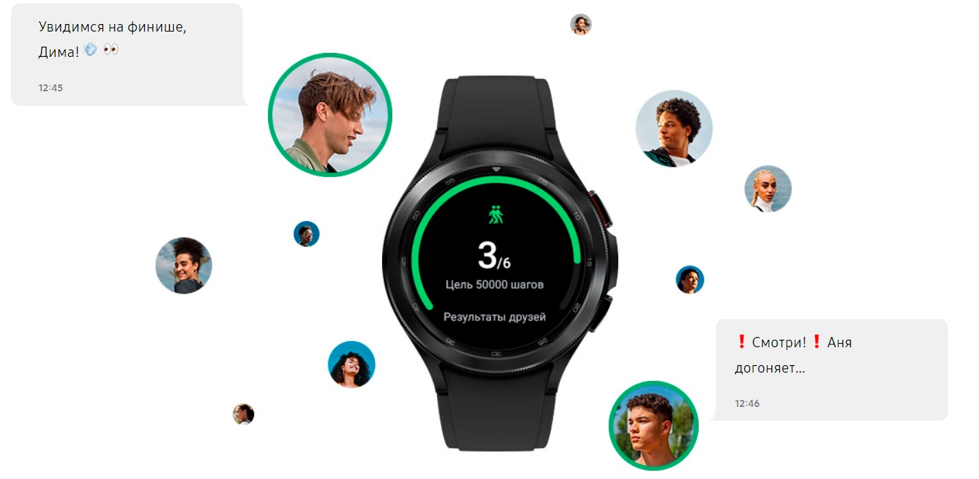 Групповая активностьБлагодаря коммуникации с друзьями, использующими часы от Samsung, вы сможете получить максимальную пользу от них в кругу близких. Поддержка, соперничество, награды – все это стало достоянием общества пользователей данной модели, присоединившихся к интерактивной группе, чтобы сравнивать свои результаты с показателями активности друзей.